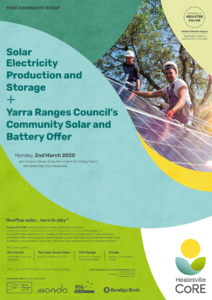 Healesville CoRE is entering its fourth year of renewable energy leadership in the Yarra Valley by inviting a collection of local and national solar energy players to “talk everything Solar” at the Darron Honey Centre on Monday 2nd March at 7pm.